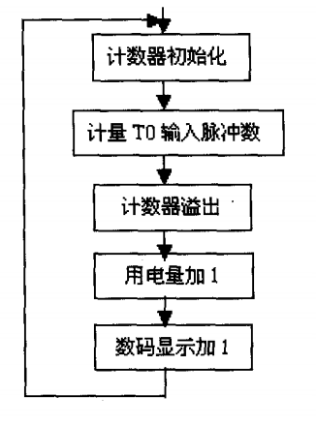 電能計量子程序流程圖如圖5所示。電能計量采用遞加的方式,單片機的P3.4(T0)端輸入用電計量脈沖,計滿3200個脈沖為一度電,用電量加1,數(shù)碼顯示加1。用電量存儲在EEPROM中,每增1度電則電量重新存儲一次,管理微機定時從各個電表的EEPROM中采集用電數(shù)據(jù)。
