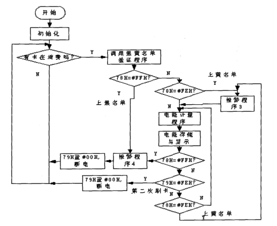 1、如電能表處于待機狀態(tài),則接收刷卡,讀出卡內(nèi)信息,同時,置RAM中79H的值為#FFH,然后返回主程序。主程序調(diào)用黑黃名單驗證子程序,如用戶卡已上電量不足的黑名單則報警同時返回主程序;當用戶卡上電量小于10度的黃名單時報警但繼續(xù)為該用戶供電,直到電費全部用完后停止供電;當用戶卡不上黑黃名單時,則正常為該用戶供電,同時調(diào)用電能計量程序。