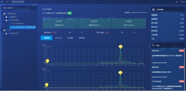 實(shí)時(shí)監(jiān)控:運(yùn)行工況;實(shí)時(shí)監(jiān)測(cè)數(shù)據(jù)包括油煙凈化器和風(fēng)機(jī)的運(yùn)行電流,根據(jù)電流數(shù)值來(lái)判斷當(dāng)前進(jìn)化器的運(yùn)行狀態(tài),包括失聯(lián)、停機(jī)、運(yùn)行等狀態(tài),結(jié)合運(yùn)行數(shù)據(jù)曲線(xiàn),更加方便直觀。