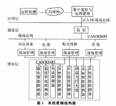 智能化監(jiān)控系統(tǒng)基于嵌入式軟硬件平臺(tái),嚴(yán)格遵從“設(shè)備智能化、系統(tǒng)網(wǎng)絡(luò)化、狀態(tài)信息化、安全可視化”的產(chǎn)品定位,構(gòu)建一體化分布式電氣火災(zāi)智能化綜合監(jiān)控系統(tǒng)。系統(tǒng)架構(gòu)基于物聯(lián)網(wǎng)系統(tǒng)模型及B/s軟件體系,按照“感知層、通信層、應(yīng)用層”標(biāo)準(zhǔn)實(shí)施系統(tǒng)建模。系統(tǒng)組成具體包括:處于感知層的電氣火災(zāi)監(jiān)控探測(cè)器、無線溫度探測(cè)器、分布式感溫光纜等;處于網(wǎng)絡(luò)層的通信網(wǎng)絡(luò)、現(xiàn)場(chǎng)總線及實(shí)現(xiàn)區(qū)域監(jiān)測(cè)管理功能的監(jiān)控器等;處于應(yīng)用層的監(jiān)控設(shè)備、遠(yuǎn)程監(jiān)控中心及客戶終端等。系統(tǒng)邏輯結(jié)構(gòu),如圖1所示。