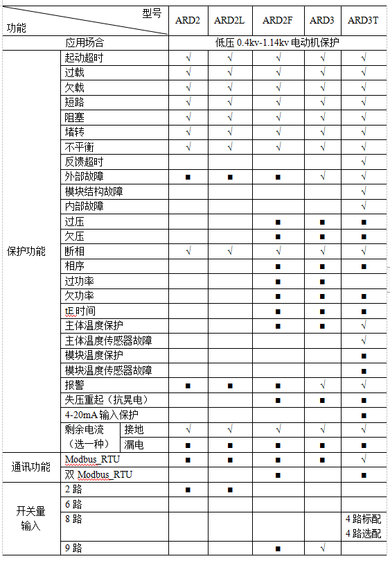由表3可見(jiàn),各企業(yè)生產(chǎn)的產(chǎn)品所增添的保護(hù)功能各有特色,但還沒(méi)有一個(gè)產(chǎn)品包含該全部功能,例如:阻塞保護(hù)功能與堵轉(zhuǎn)相比,其結(jié)果均為電動(dòng)機(jī)轉(zhuǎn)子被卡而停止轉(zhuǎn)動(dòng),但阻塞是指起動(dòng)過(guò)程結(jié)束后發(fā)生的情況,而堵轉(zhuǎn)是指起動(dòng)過(guò)程中發(fā)生的情況,顯然,其保護(hù)動(dòng)作的要求是不同的。