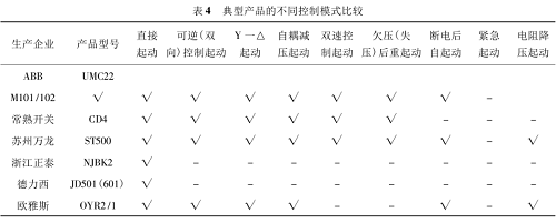從各企業(yè)生產(chǎn)的產(chǎn)品所具有的控制模式來(lái)看,一般均可直接起動(dòng)電動(dòng)機(jī)。由于電子技術(shù)的發(fā)展,許多企業(yè)根據(jù)用戶需求增添了許多控制模式,如 ABB 公司、蘇州萬(wàn)龍電氣集團(tuán)股份有限公司(以下簡(jiǎn)稱蘇州萬(wàn)龍)及歐雅斯的產(chǎn)品具有的控制模式較多,特別是 ABB 公司的產(chǎn)品,還帶有緊急起動(dòng)模式,以滿足在特殊情況下快速起動(dòng)電動(dòng)機(jī)的需要。歐雅斯及蘇州萬(wàn)龍的產(chǎn)品均帶有常用的自耦減壓及電阻降壓起動(dòng)模式,滿足了大多數(shù)用戶常用的電動(dòng)機(jī)起動(dòng)方式,因而深受歡迎。