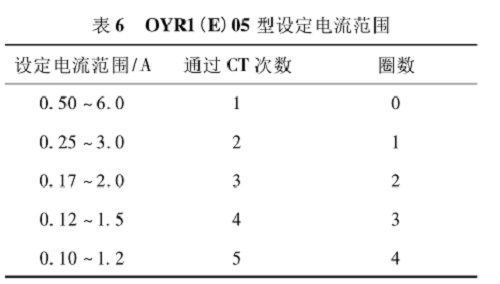 低壓電動(dòng)機(jī)保護(hù)器的額定電流設(shè)置,除取決于輸出繼電器的觸點(diǎn)容量外,還取決于采集主回路電流信號(hào)的電流互感器(Current Transformer,CT)。一般額定電流值不大時(shí),采用內(nèi)置 CT 輸出的信號(hào)進(jìn)行處理。但是,當(dāng)工作電流太小,未達(dá)到0. 5 A 時(shí),可以通過(guò)增加電纜穿過(guò) CT 上窗口的圈數(shù)來(lái)提高二次感應(yīng)電流,達(dá)到與保護(hù)線路的匹配,如表 6 所示。