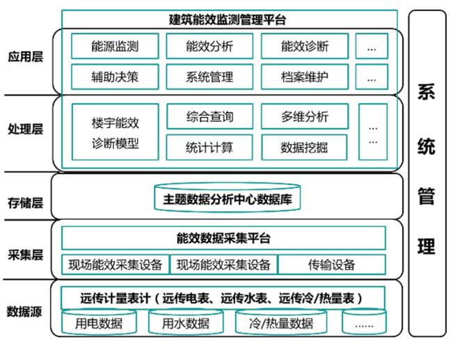 如圖1所示,綜合能耗監(jiān)測系統(tǒng)框架包括功能應(yīng)用層、邏輯處理層、數(shù)據(jù)存儲層、數(shù)據(jù)采集層、數(shù)據(jù)源五層架構(gòu)。其中,功能應(yīng)用層包括能源監(jiān)測、能效分析、能效診斷、輔助決策以及檔案維護(hù)、系統(tǒng)管理等用戶功能,通過多維度、可視化的系統(tǒng)功能界面實(shí)現(xiàn)與用戶的信息互動;邏輯處理層通過建立能耗評估模型,并利用數(shù)據(jù)挖掘、統(tǒng)計(jì)計(jì)算、多維分析等手段對能耗數(shù)據(jù)進(jìn)行分析,為功能應(yīng)用層提供直接的數(shù)據(jù)支持;數(shù)據(jù)存儲層利用主流結(jié)構(gòu)化數(shù)據(jù)庫對能耗數(shù)據(jù)進(jìn)行分類存儲,提高邏輯處理層的處理性能;數(shù)據(jù)采集層利用終端采集設(shè)備實(shí)現(xiàn)對智能電表、智能水表和智能冷熱計(jì)量表等遠(yuǎn)傳終端的數(shù)據(jù)源采集,為整個綜合能耗監(jiān)測系統(tǒng)提供基礎(chǔ)數(shù)據(jù)支撐。