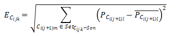 能耗指數(shù):能耗指數(shù)可以反應(yīng)出能耗網(wǎng)絡(luò)中一個節(jié)點(diǎn)的能耗量在該節(jié)點(diǎn)所在等級中所占的比例,若節(jié)點(diǎn)Cij+1l表示節(jié)點(diǎn)Cijk關(guān)系子集SetCijk-Son中的一個節(jié)點(diǎn),則能耗指數(shù)P的計(jì)算式為: