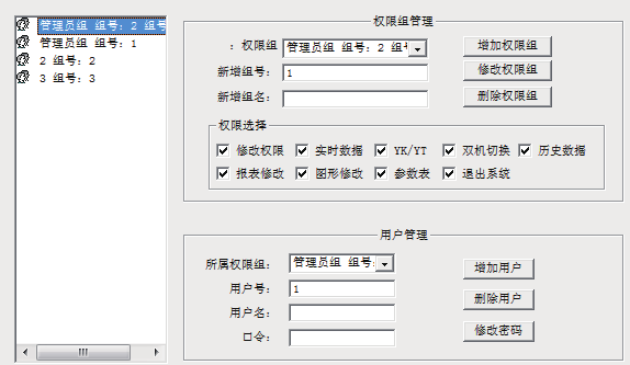 為保障系統(tǒng)安全穩(wěn)定運(yùn)行,設(shè)置了用戶(hù)權(quán)限管理功能。通過(guò)用戶(hù)權(quán)限管理能夠防止未經(jīng)授權(quán)的操作(如遙控的操作,數(shù)據(jù)庫(kù)修改等)??梢远x不同級(jí)別用戶(hù)的登錄名、密碼及操作權(quán)限,為系統(tǒng)運(yùn)行、維護(hù)、管理提供可靠的安全保障。