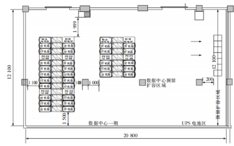 某煤礦模塊化數(shù)據(jù)中心的平面配置如圖 1 所示,某煤礦數(shù)據(jù)中心實景如圖 2 所示。 某煤礦數(shù)據(jù)中心共采購兩組 IDS 2000 雙 排模塊化數(shù)據(jù)中心,西側(cè)模塊數(shù)據(jù)中心包含一體化配電柜、行間空調(diào)、UPS 電源、雙回路電源輸入柜、UPS 電源輸出柜、空調(diào)電源柜,東側(cè)模塊數(shù)據(jù)中心包括配電柜、行間空調(diào)、中控、監(jiān)控和 ODF 配線柜,其中還在數(shù)據(jù)中心機(jī)房預(yù)留有擴(kuò)容區(qū)域。