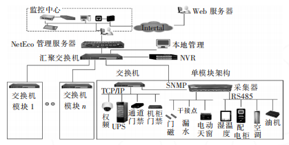 微模塊數(shù)據(jù)中心的機(jī)房管理采用 NetEco 基礎(chǔ)設(shè)施管理系統(tǒng),此系統(tǒng)由管理軟件和其他部件構(gòu)成,實現(xiàn)了對數(shù)據(jù)中心的溫濕度、空調(diào)系統(tǒng)、供配電系 統(tǒng)、UPS 后備電源、消防及監(jiān)控等多系統(tǒng)的數(shù)據(jù)采集與監(jiān)控,將各子系統(tǒng)和分散環(huán)節(jié)集中統(tǒng)一管理,為智 能化微模塊數(shù)據(jù)中心的全系統(tǒng)監(jiān)控提供了可靠保 障。NetEco 管理系統(tǒng)架構(gòu)圖如圖 3 所示。