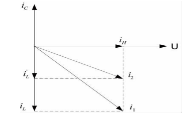 根據(jù)電路原理,電流在電感元件中作功時(shí),電流滯后于電壓90o。而電流在電容元件中作功時(shí),電壓滯后于電流90o。在同一電路中,電感電流與電容電流方向相反,互差180o,兩者的電流相互抵消,使電流的矢量與電壓矢量之間的夾角縮小。感性負(fù)荷的有功電流IH與電壓U同相位,假設(shè)電感和電容的合成電流為I1,無(wú)功功率為Q1,功率因數(shù)cosφ1,各相量的相位關(guān)系如下圖。