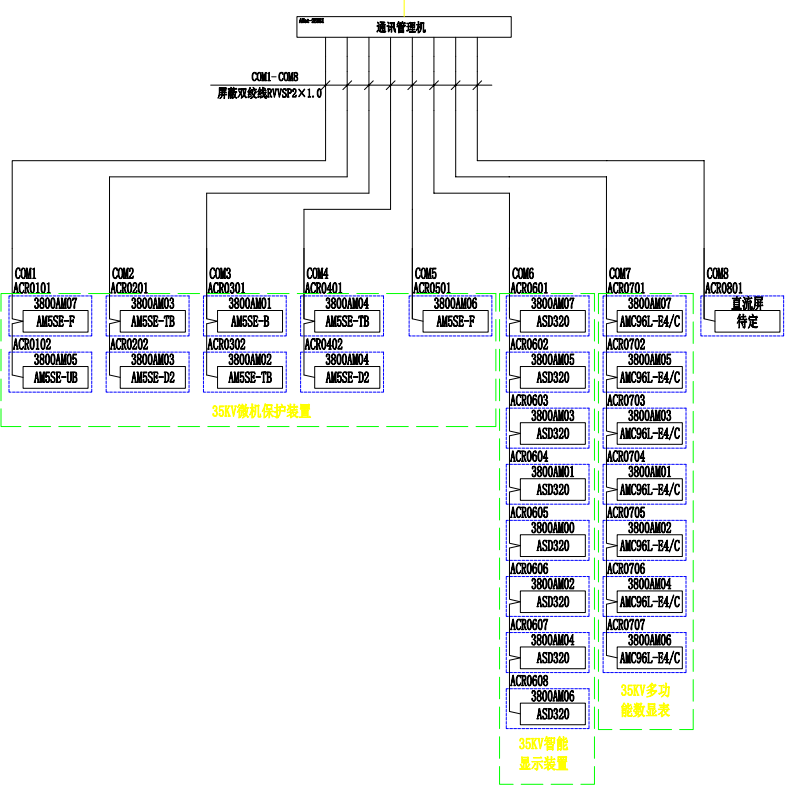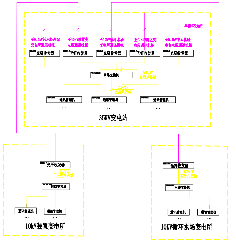 本工程為山東凱瑞英材料科技有限公司羥脲磺胺類醫(yī)藥中間體產(chǎn)業(yè)鏈項目,本工程系統(tǒng)包含3個變電站(所)分別為35/10kV變電站、10kV裝置變電所和10kV循環(huán)水廠變電所。三個變電所均配置有后臺監(jiān)控系統(tǒng),35/10kV變電站中放置三套后臺電腦,兩個10kV變電所各配置一套后臺系統(tǒng)。除10kV部分保護數(shù)據(jù)外,變電所下的0.4kV進線保護和母聯(lián)保護,馬達保護裝置數(shù)據(jù)均上傳接入10kV變電所后臺系統(tǒng)。最終兩個10kV變電所數(shù)據(jù)通過光纖上傳到35/10kV變電站后臺,進行集中監(jiān)控。35/10kV變電站集控系統(tǒng)同時預(yù)留了中心化驗室變電所,辦公樓變電所,污水處理站變電所,罐區(qū)變電所的數(shù)據(jù)接口。集控系統(tǒng)要求配備了智能設(shè)備接口,充分保證系統(tǒng)的安全可靠運行,也要求兼顧目前綜合自動化系統(tǒng)的全面性、先進性。
