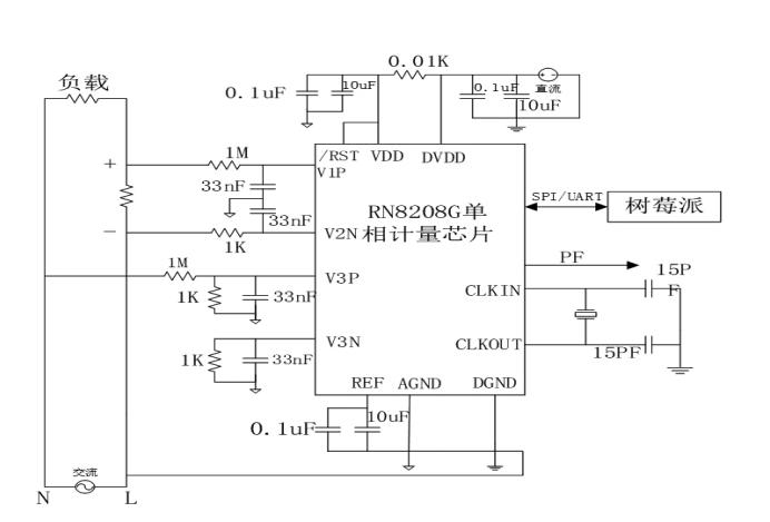 系統(tǒng)采用IM1277單相互感式電能質(zhì)量檢測(cè)儀采集電量信息,能夠完成電能測(cè)量、采集及傳輸,準(zhǔn)確高精度地測(cè)量單相交流電壓、電流、功率、電流及總電量等電參數(shù)。采集模塊的電路圖如圖3-2所示。220V電壓經(jīng)過(guò)電壓互感器和電流互感器處理,變?yōu)檩^小的電流信號(hào)并通過(guò)電路傳到電能計(jì)量芯片,將模擬信號(hào)轉(zhuǎn)換為數(shù)字信號(hào),然后通過(guò)串口送入樹(shù)莓派控制中心。