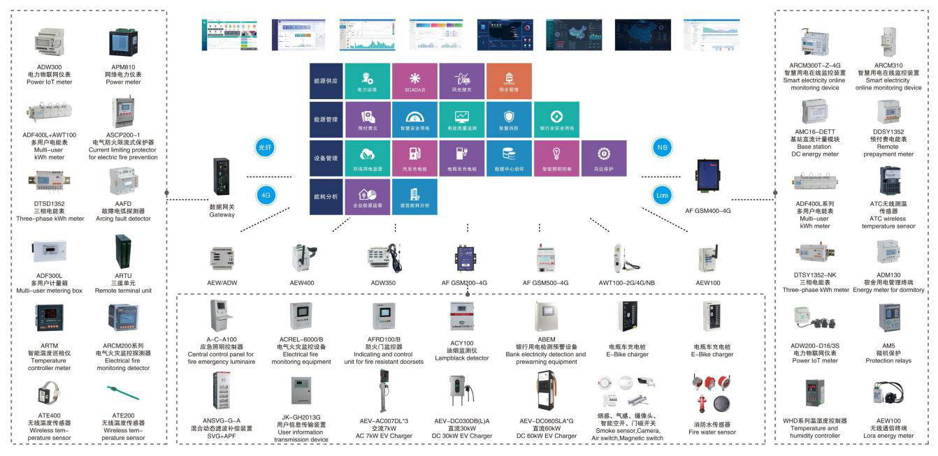 安科瑞根據多年來的項目經驗,結合用戶實際需求,開發(fā)了各類有線、區(qū)域無線、廣域無線通訊產品,包括網關和終端設備。支持RS485、以太網、LORA、ZigBee、GPRS、4G、NB-IOT等多種通訊方式,隨著5G建設步伐的加快,未來將會有越來越多的通訊方式融入產品,服務于泛在電力物聯(lián)網建設。