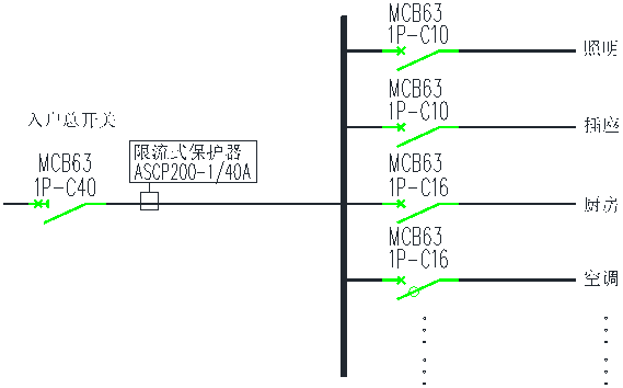 ASCP200-1型電氣防火限流式保護器建議安裝在入戶開關下端,額定電流值根據(jù)入戶開關的具體規(guī)格進行設置,典型應用示意圖如圖3所示: