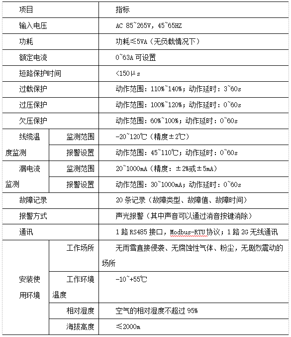 E)電纜溫度監(jiān)測功能,被測線纜溫度超過報警設定值時,保護器告警或限流保護(可設);