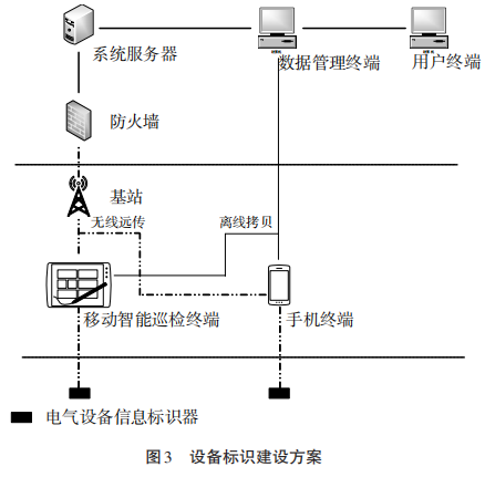 閱讀器兼容各頻段的電子信息標(biāo)識器,當(dāng)電子信息標(biāo)識器進(jìn)入閱讀器發(fā)射的射頻場后,其憑借感應(yīng)電流所獲得的能量發(fā)送出存儲在電子信息標(biāo)識器內(nèi)部的電網(wǎng)設(shè)備相關(guān)信息。由于RFID技術(shù)具備穿透性,所以閱讀器可實(shí)現(xiàn)對電子信息標(biāo)識器的穿透讀取。閱讀器可采用移動智能巡檢終端或者帶有NFC(Near Field Communication)近場通信功能的手機(jī)等形式[3]。設(shè)備標(biāo)識建設(shè)方案如圖3所示。