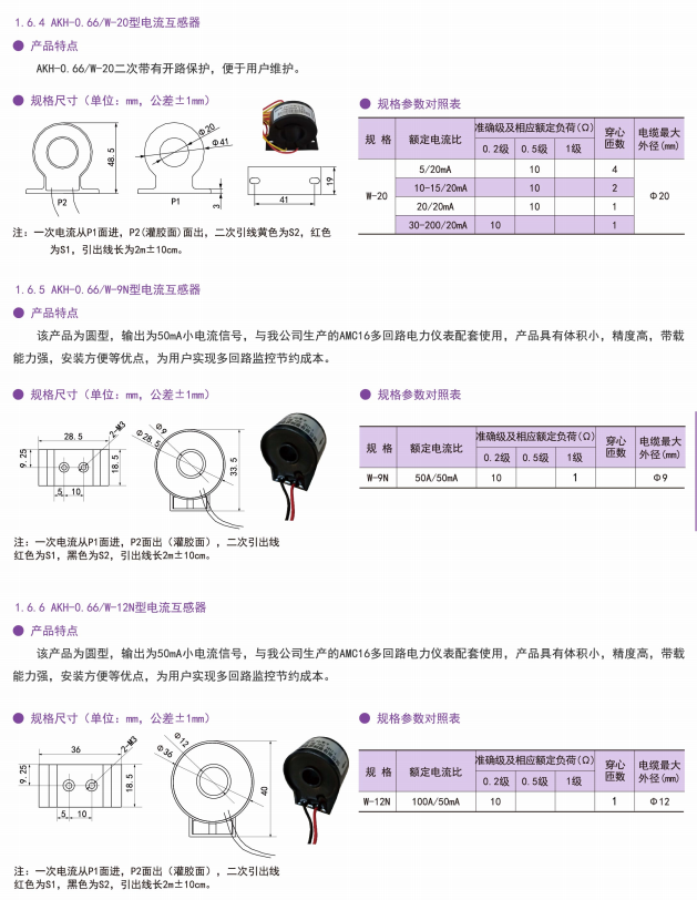 AKH-0.66 W系列電流互感器輸出為5-20mA等小電流信號,與我公司生產(chǎn)的AMC16多回路電力儀表配套使用,產(chǎn)品具有體積小,精度高,帶載能力強(qiáng),安裝方便等優(yōu)點(diǎn),為用戶實(shí)現(xiàn)多回路監(jiān)控節(jié)約成本,有圓型和方型供用戶根據(jù)需要選用。