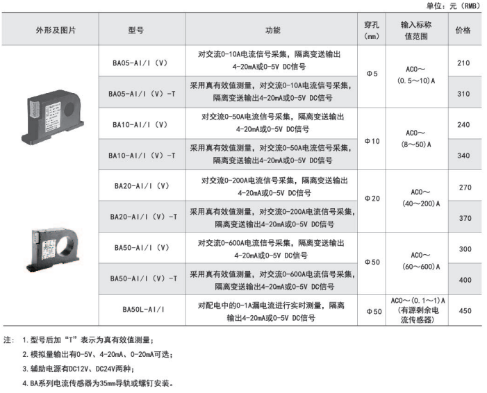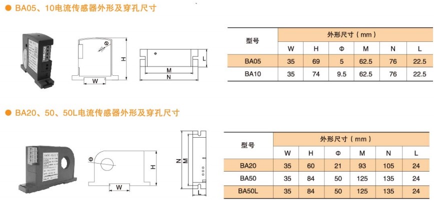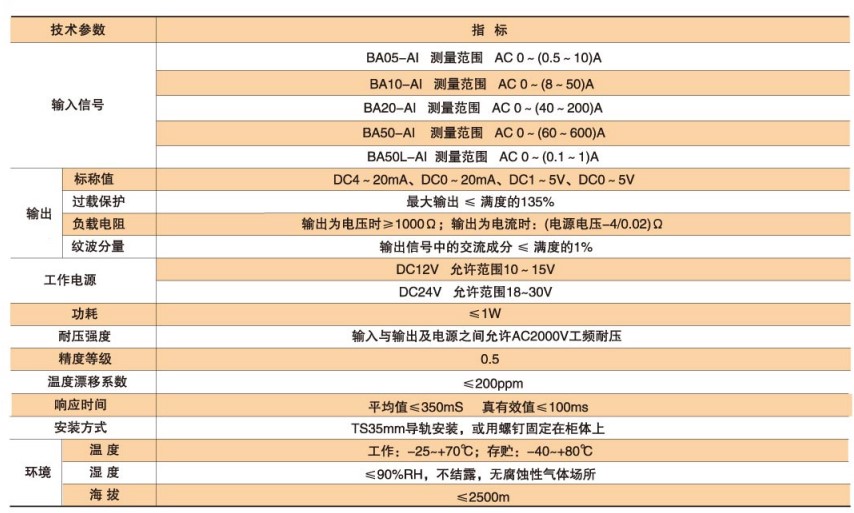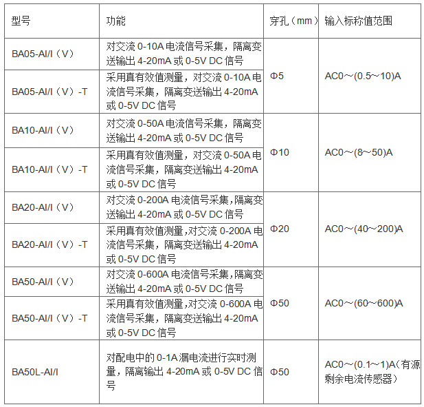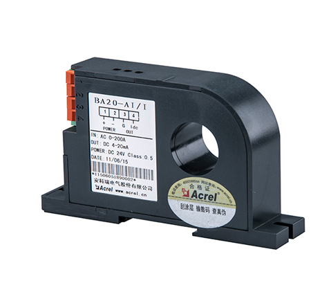 BA系列產(chǎn)品應(yīng)用電磁感應(yīng)原理,對(duì)電網(wǎng)中的交流電流進(jìn)行實(shí)時(shí)測(cè)量,將其隔離變換為標(biāo)準(zhǔn)的直流信號(hào)輸出。
