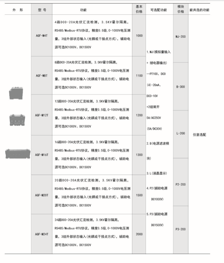 AGF-T穿孔式光伏匯流采集裝置是專門應(yīng)用于智能光伏匯流箱,用于監(jiān)測光電池陣列中電池板運(yùn)行狀態(tài),組串電流測量,匯流箱中防雷器狀態(tài)采集、直流斷路器狀態(tài)采集、裝置帶有RS485接口可以把測量和采集到的數(shù)據(jù)和設(shè)備狀態(tài)上傳。