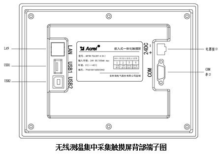 無線測(cè)溫集中采集觸摸屏:無線測(cè)溫觸摸屏可以嵌入式安裝在高壓柜、低壓抽屜柜內(nèi),每臺(tái)裝置可以接收240個(gè)傳感器的數(shù)據(jù),可與ATE100、ATE200、ATE300三種傳感器選配使用。裝置帶有一路485接口、可選配一路以太網(wǎng)口,可將采集到的溫度數(shù)據(jù)上傳到監(jiān)控中心。