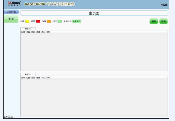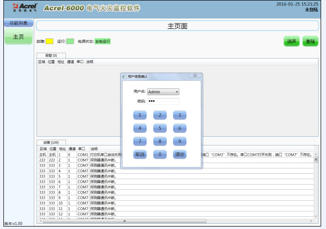包含“登陸”、“消音”、“運(yùn)行監(jiān)視界面” 及“系統(tǒng)狀態(tài)欄”四部分,可以分別通過點(diǎn)擊系統(tǒng)主界面上方的菜單欄或快速啟動欄內(nèi)按鈕進(jìn)入各相關(guān)功能界面。