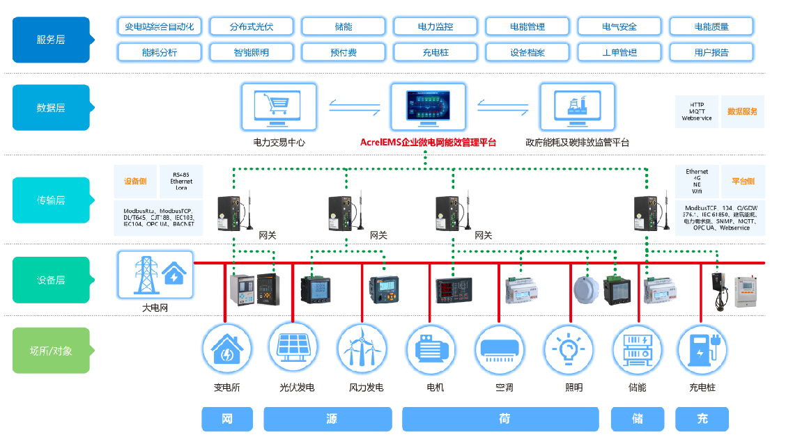 在企業(yè)微電網(wǎng)源、網(wǎng)、荷、儲、充的各個(gè)關(guān)鍵節(jié)點(diǎn)安裝計(jì)量和分析裝置,搭建三級計(jì)量體系,用于監(jiān)測企業(yè)能耗總量和能耗強(qiáng)度,從而診斷低能效環(huán)節(jié)。平臺根據(jù)最新的電網(wǎng)價(jià)格、用電負(fù)荷、電網(wǎng)調(diào)度指令等情況,調(diào)整能源使用策略,優(yōu)先使用綠色能源,使企業(yè)微電網(wǎng)始終高效穩(wěn)定運(yùn)行,快速響應(yīng)電網(wǎng)需求,實(shí)現(xiàn)能源互聯(lián)、信息互動,也可以把數(shù)據(jù)上傳政府能源管控平臺,例如發(fā)改委、工信部、住建部門重點(diǎn)用能單位能耗在線監(jiān)測平臺、電力需求側(cè)平臺、建筑能耗監(jiān)測平臺等。