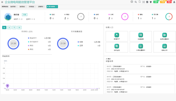 為平臺主界面,針對于企業(yè)微電網(wǎng)的源、網(wǎng)、荷、儲、充的各個(gè)關(guān)鍵節(jié)點(diǎn)安裝監(jiān)測、分析、保護(hù)、治理裝置, 通過高性能邊緣計(jì)算網(wǎng)關(guān)采集數(shù)據(jù)并上傳至企業(yè)微網(wǎng)平臺。平臺根據(jù)新的電網(wǎng)價(jià)格、用電負(fù)荷、電網(wǎng)調(diào)度指令等情況, 調(diào)整各系統(tǒng)控制策略并遠(yuǎn)程下發(fā),使企業(yè)微電網(wǎng)始終高效穩(wěn)定運(yùn)行,降低企業(yè)用電成本,實(shí)現(xiàn)能源互聯(lián)、信息互動。