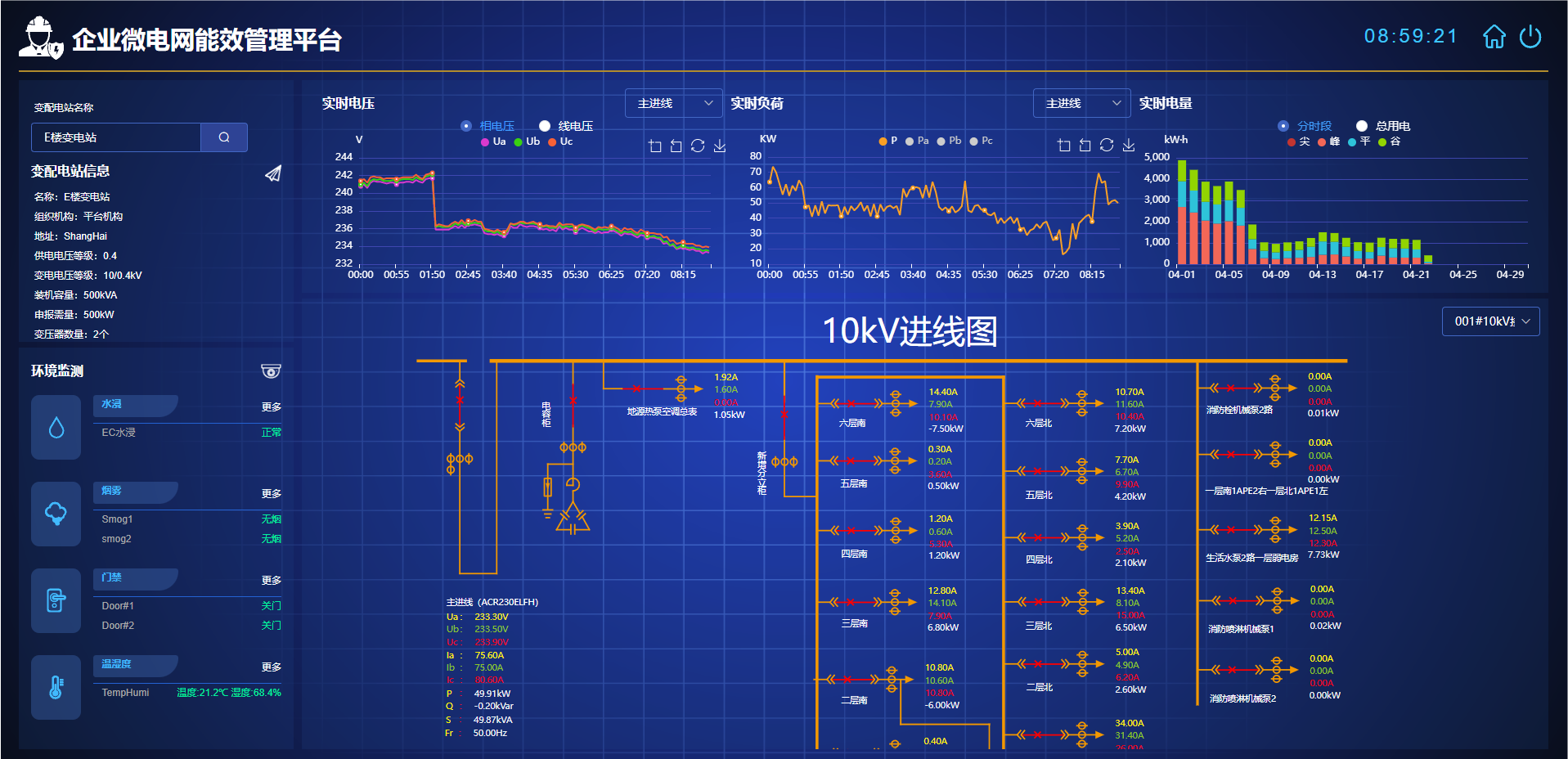 平臺可實(shí)時(shí)監(jiān)測變電所內(nèi)變壓器、各配電回路的運(yùn)行情況,并記錄各電力參數(shù)的歷史數(shù)據(jù)。