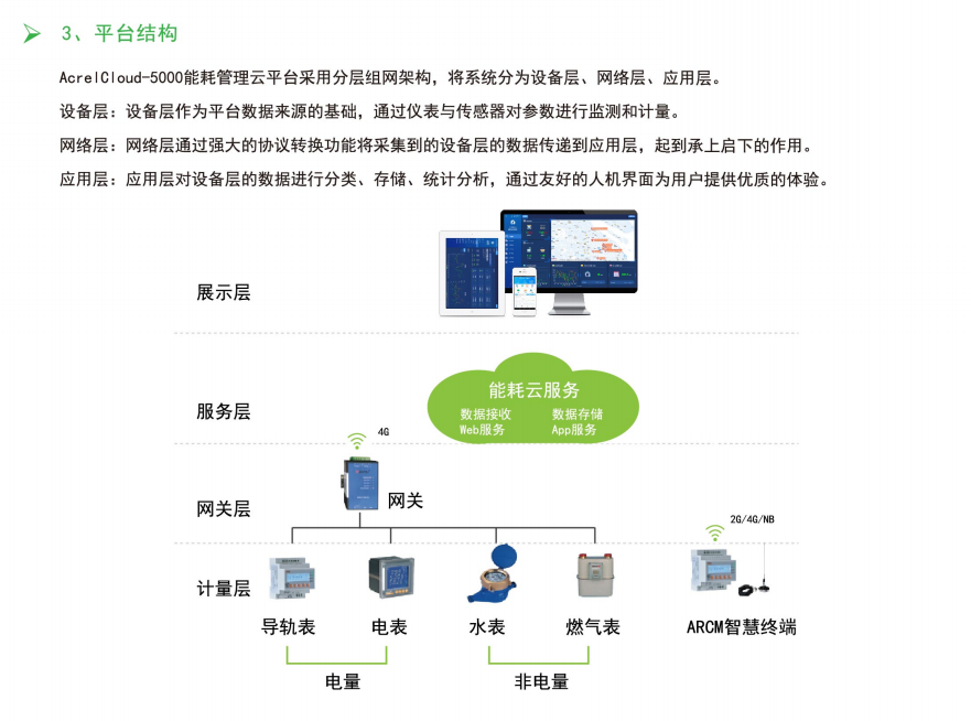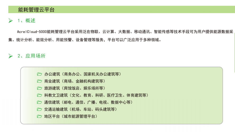 AcrelCloud-5000能耗管理云平臺(tái)采用泛在物聯(lián)、云計(jì)算、大數(shù)據(jù)、移動(dòng)通訊、智能傳感等技術(shù)手段可為用戶提供能源數(shù)據(jù)采集、統(tǒng)計(jì)分析、能效分析、用能預(yù)警、設(shè)備管理等服務(wù),平臺(tái)可以廣泛應(yīng)用于多種領(lǐng)域