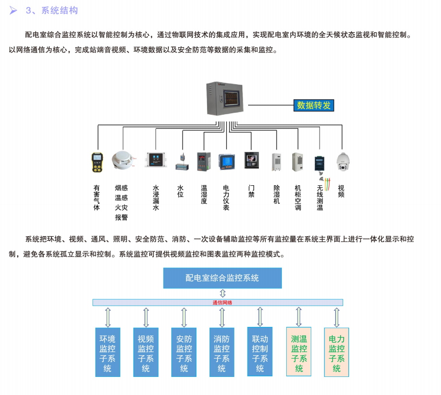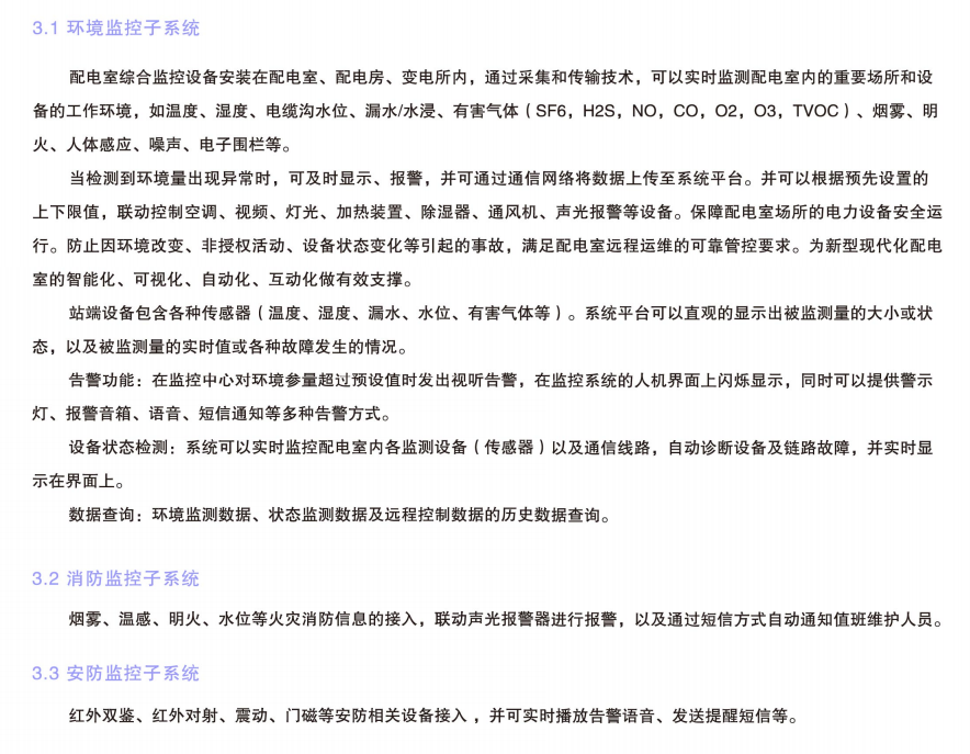 配電室綜合監(jiān)控是整個電能管理系統(tǒng)中的一個重要環(huán)節(jié),一般以低壓網(wǎng)中的配電室環(huán)境溫濕度、配電開關(guān)狀態(tài)、漏水/水浸、煙霧及配電室的防盜為監(jiān)測對象,對配電房重要設(shè)備運行狀態(tài)的多種參數(shù)和狀態(tài)進行本地聯(lián)動控制、遠程集中監(jiān)控、手機短信報警。配電室的全信息采集和監(jiān)控對配電室自動化運行管理、檢修維護、防災(zāi)預(yù)警、安全防護、電力需求管理等應(yīng)用具有重大意義。