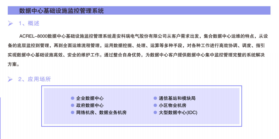 Acrel-8000數(shù)據(jù)中心基礎(chǔ)設(shè)施監(jiān)控管理系統(tǒng)是安科瑞電氣股份有限公司從客戶需求出發(fā),集合數(shù)據(jù)中心運(yùn)營的特點(diǎn),從設(shè)備的底層監(jiān)控到管理,再到全面運(yùn)營流程管理,運(yùn)用數(shù)據(jù)挖掘、處理、運(yùn)算等多種手段,對(duì)各種工作進(jìn)行高效協(xié)調(diào)、調(diào)度、指引實(shí)現(xiàn)數(shù)據(jù)中心基礎(chǔ)設(shè)施高效、安全的維護(hù)工作。通過整合自身優(yōu)勢(shì),為數(shù)據(jù)中心客戶提供數(shù)據(jù)中心集中監(jiān)控管理完整的